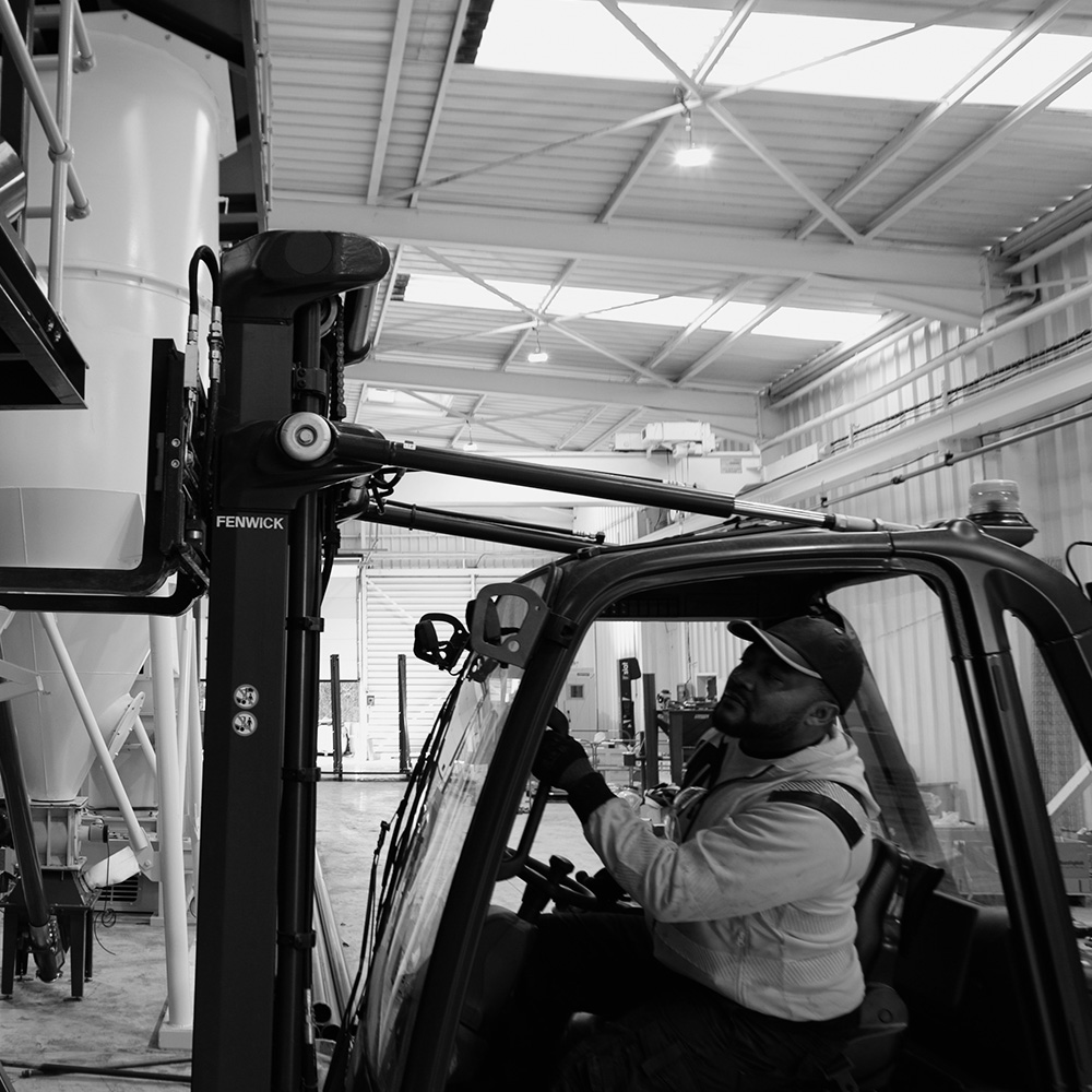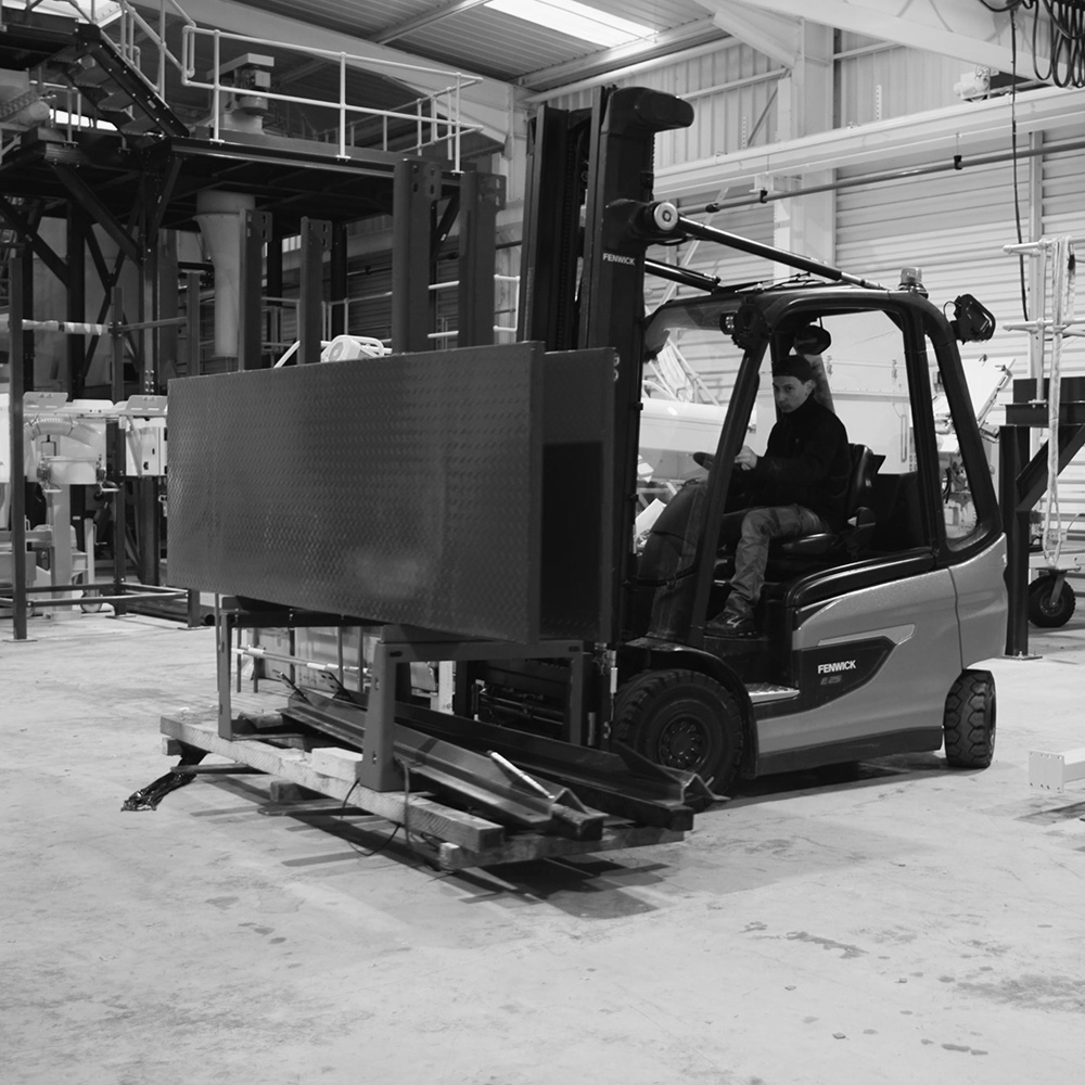 Nos équipes opérationnelles exécutent les travaux clés en main : fourniture des engins, assemblage des structures et montage des lignes de production.